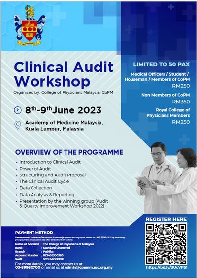 On 8th June 2023, the College of Physicians Malaysia (CoPM) in collaboration with the Royal College of Physicians (RCP) of London, organized the second National Clinical Audit Workshop, at the Academy of Medicine of Malaysia, Taman Teknologi Mranti, Bukit Jalil. This workshop was expanded and conducted in two days with full physical attendance by the participants at the College of Physicians, Malaysia, after taking into consideration feedback from the first event last year.